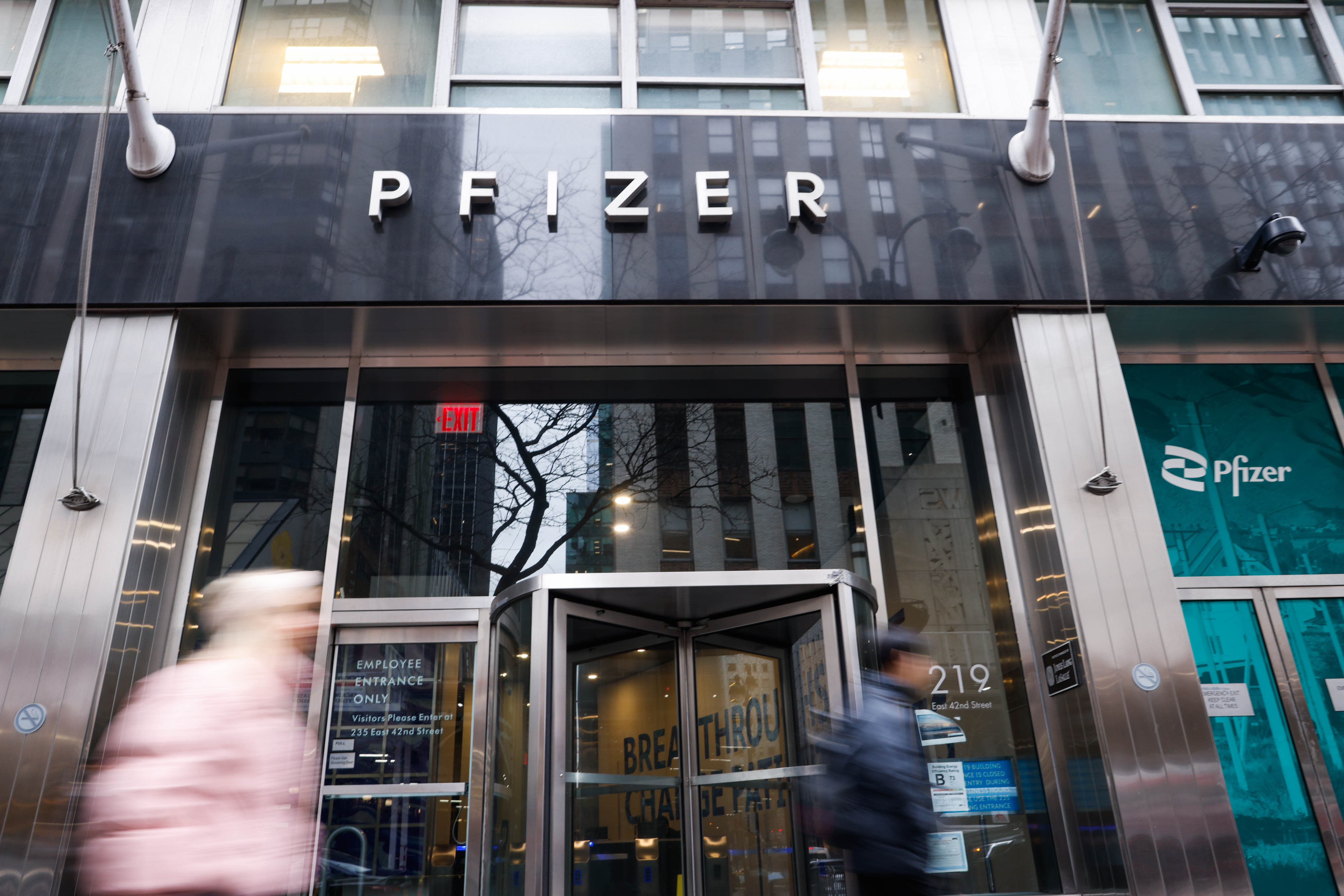 People pass by the Pfizer headquarters building in New York City, Jan. 29, 2023.