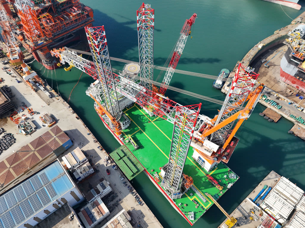 Aerial view of self-propelled jack-up wind power installation platform “Huaxia Honghu 01” after being delivered at CIMC Raffles’ Yantai construction base on March 6, 2025 in Yantai, Shandong Province of China.