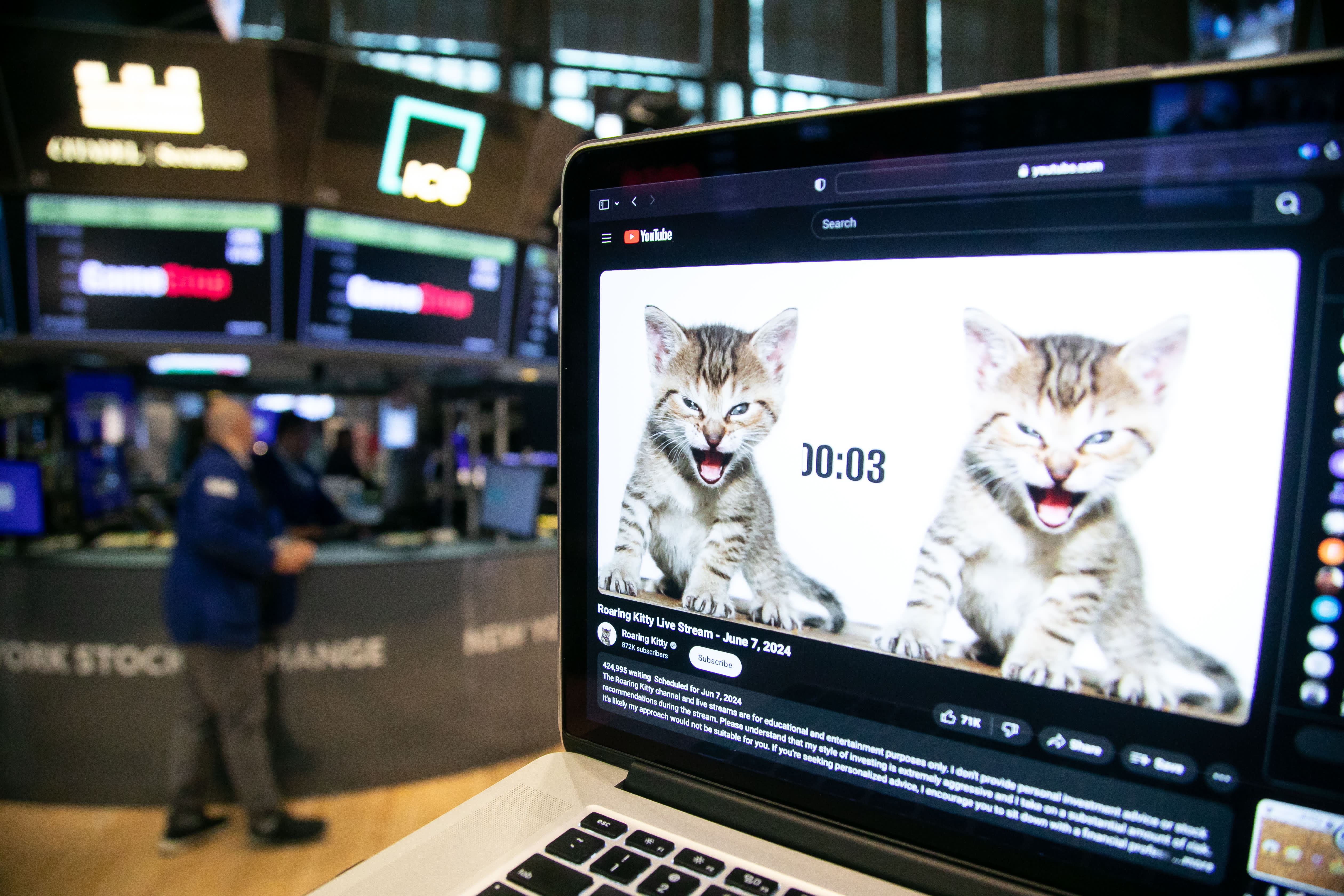 A holding page for Keith Gill, a Reddit user credited with inspiring GameStop’s rally, before a YouTube livestream arranged on a laptop at the New York Stock Exchange on June 7, 2024.