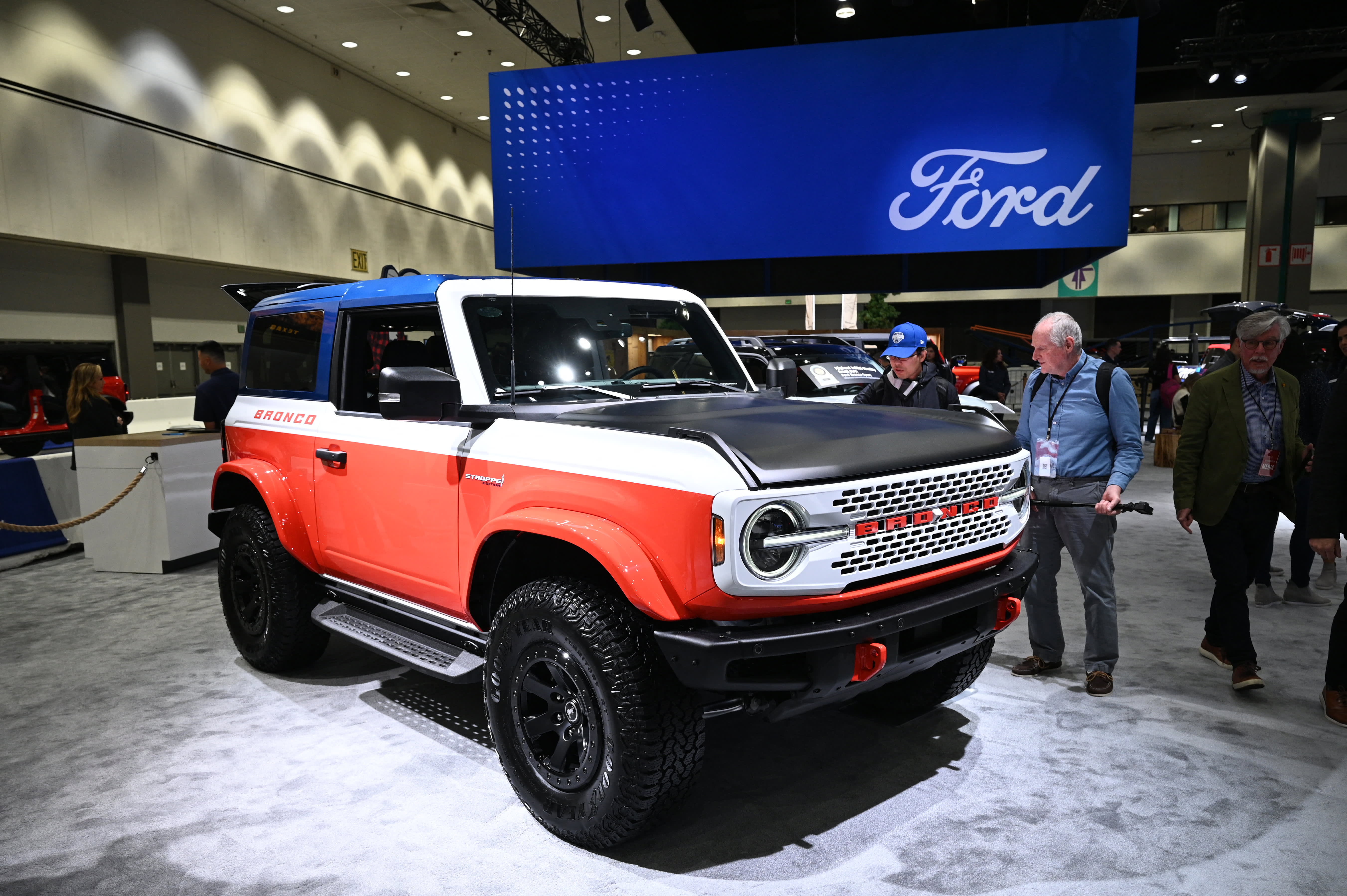 Attendees view the 2025 Ford Bronco Stroppe Special Edition during the AutoMobility LA 2024 auto show at the Los Angeles Convention Center on November 21, 2024.
