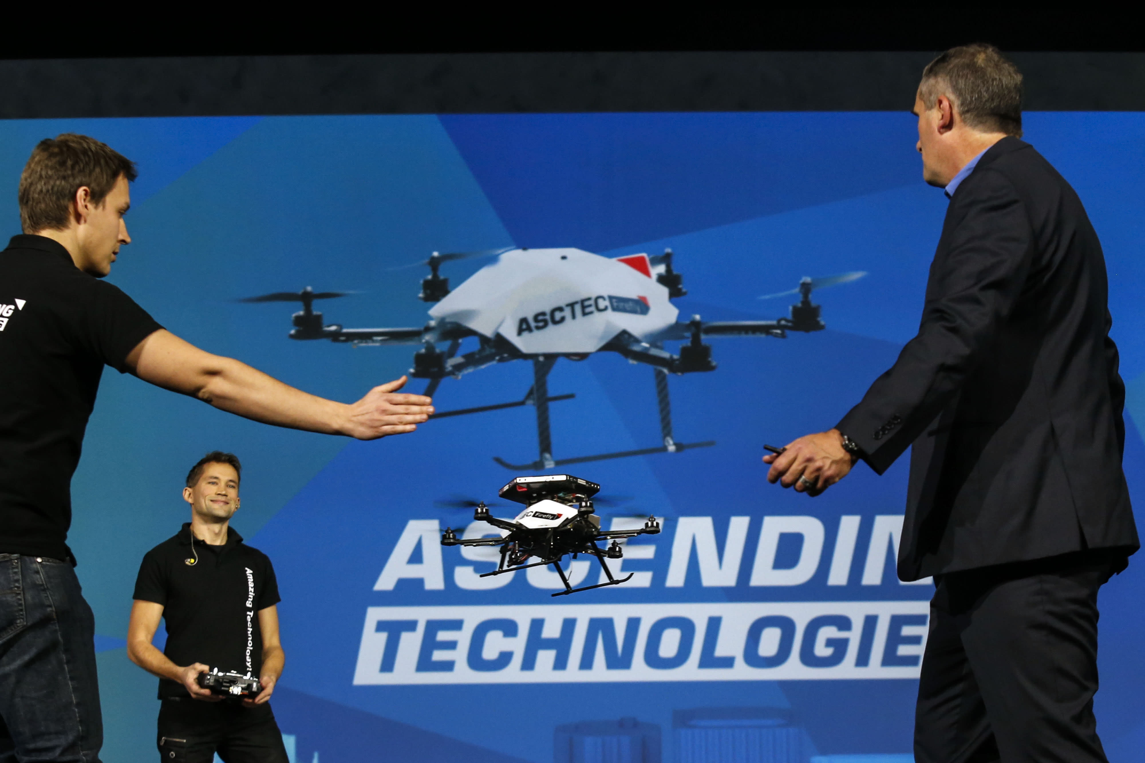 Brian Krzanich, chief executive officer of Intel Corp., right, shows the collision avoidance feature of an AscTec Firefly drone with Intel RealSense cameras during the 2015 Consumer Electronics Show (CES) in Las Vegas, Nevada.