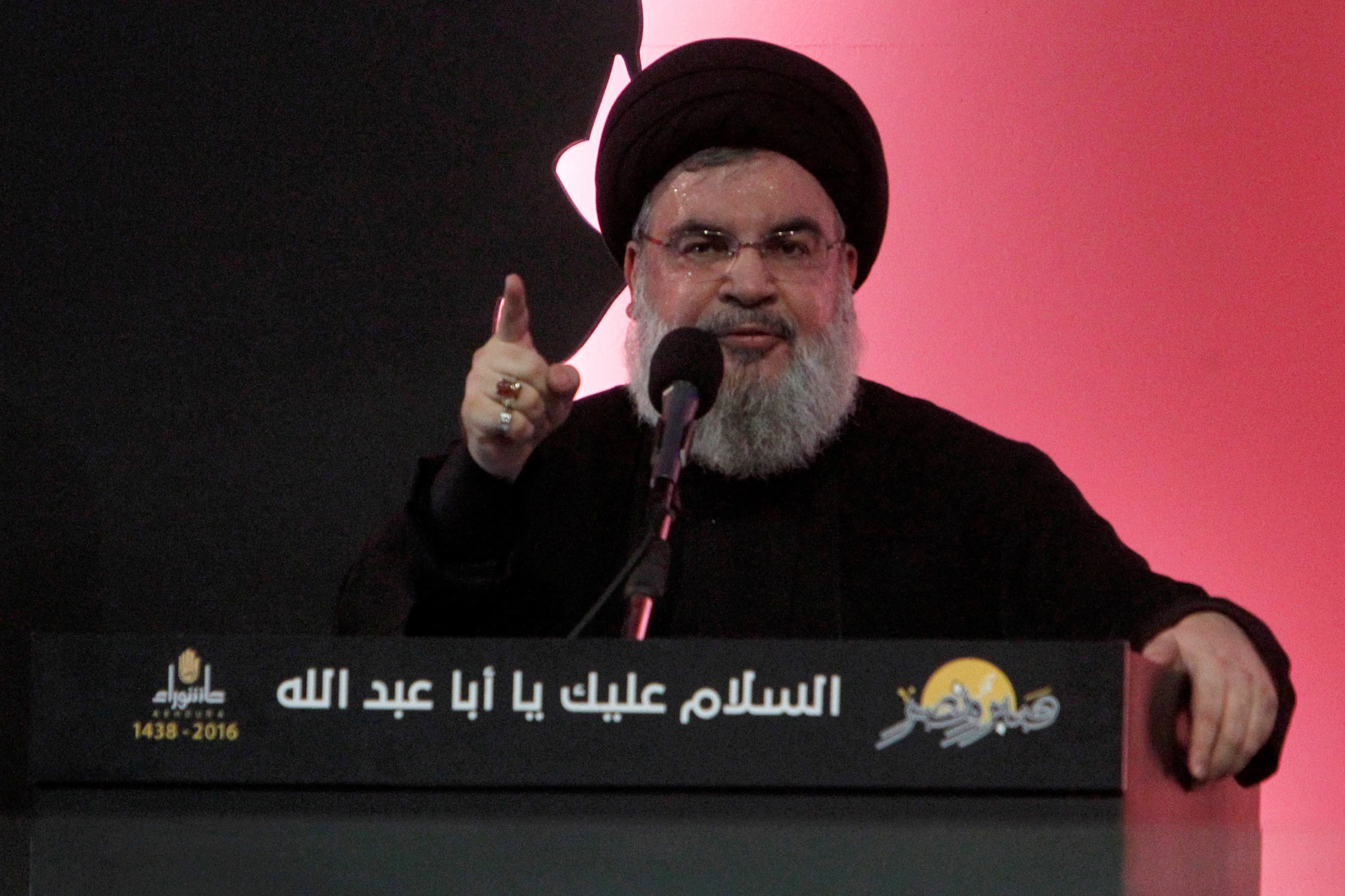 FILE PHOTO: Lebanon’s Hezbollah leader Sayyed Hassan Nasrallah addresses his supporters during a public appearance at a religious procession, one day before the Shi’ites will mark the day of Ashura, in Beirut’s southern suburbs, Lebanon October 11, 2016.
