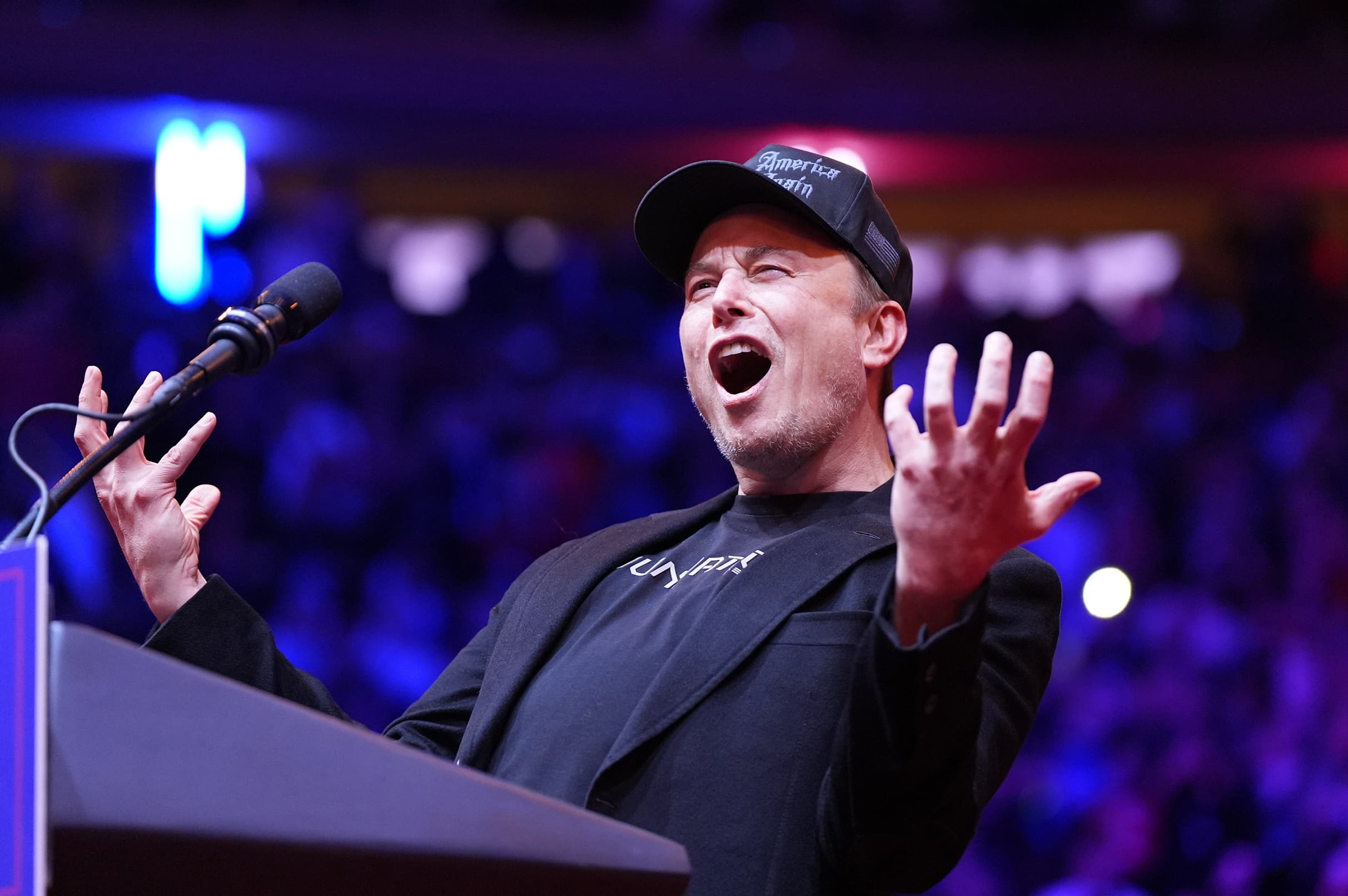 Elon Musk on stage before Republican presidential nominee former President Donald Trump speaks at a rally at Madison Square Garden in New York, NY on Sunday, October 27, 2024.