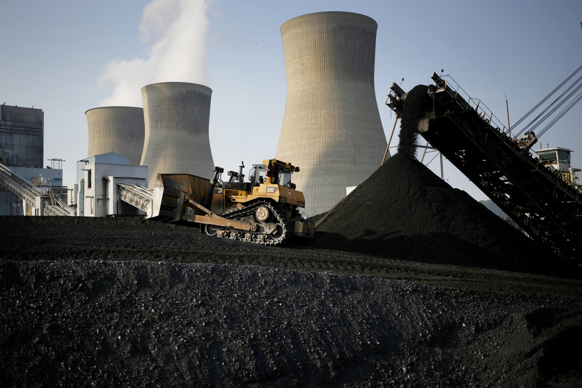 A bulldozer moves coal that will be burned to generate electricity at the American Electric Power coal-fired power plant in Winfield, West Virginia.