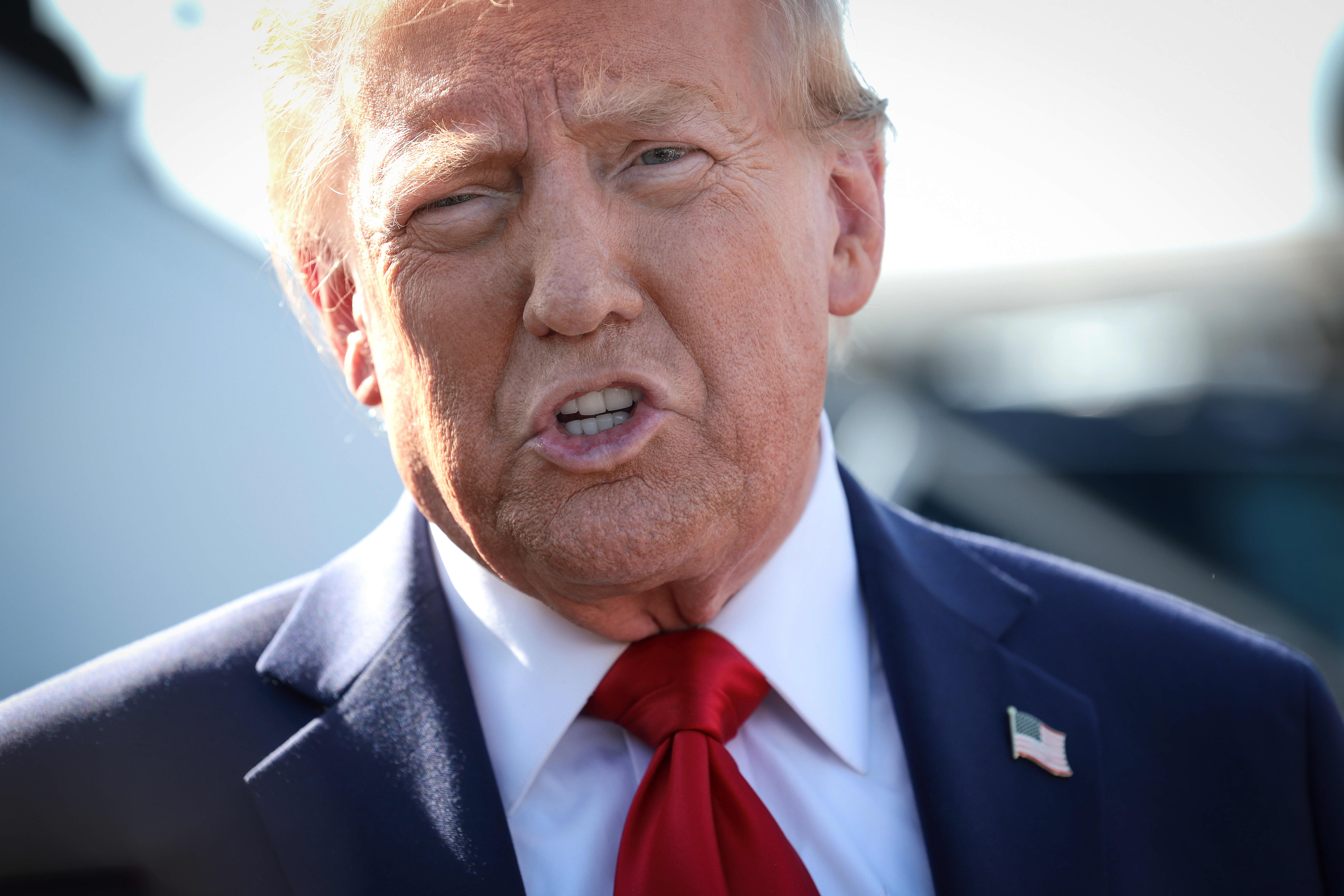 Republican presidential nominee, former U.S. President Donald Trump, addresses the media as he arrives at Detroit Metropolitan Wayne County Airport on October 18, 2024, in Detroit, Michigan.
