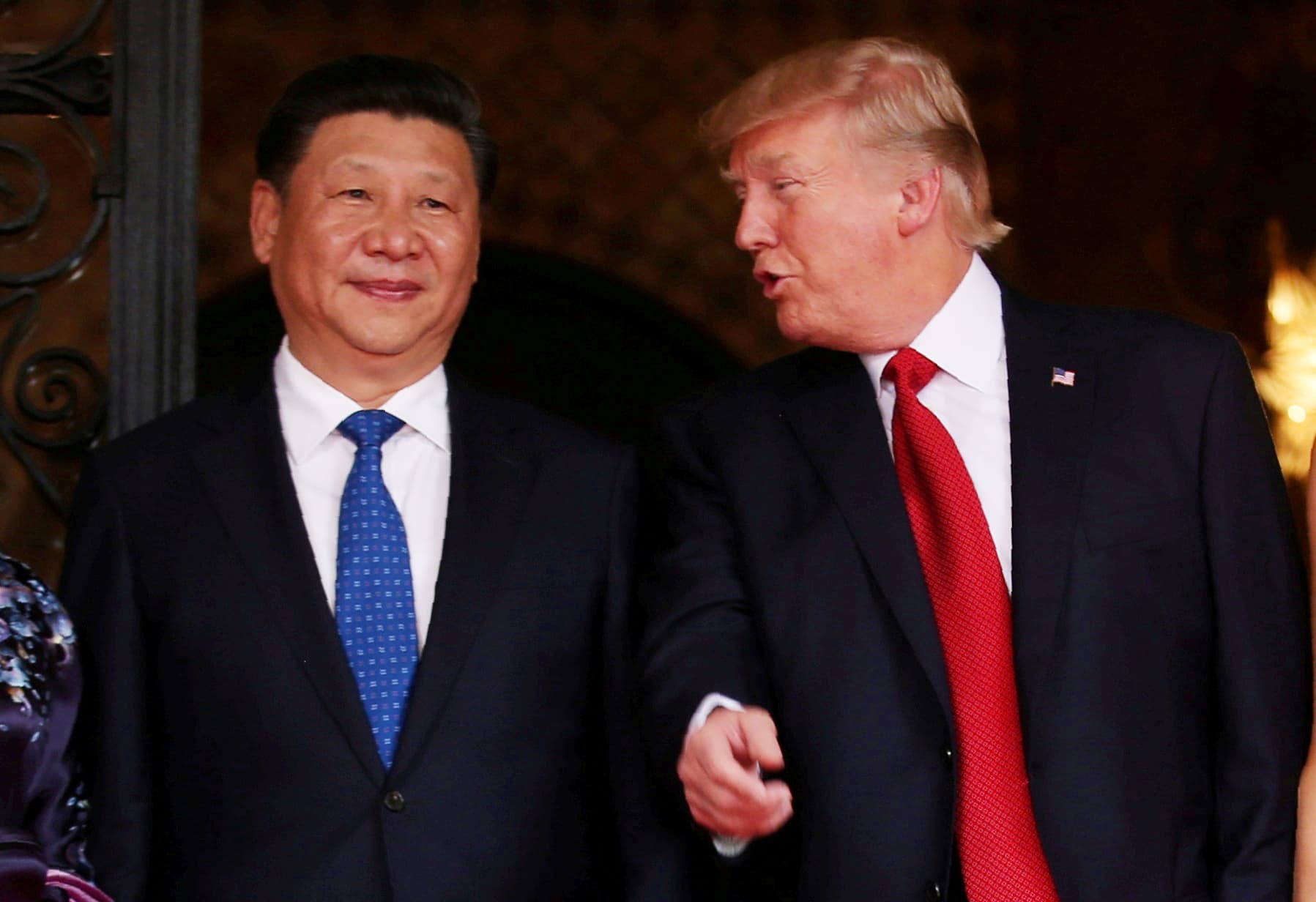 President Donald Trump talks with Chinese President Xi Jinping as Xi arrives for dinner at the start of their summit at Trump’s Mar-a-Lago estate in West Palm Beach, Florida, U.S. April 6, 2017.