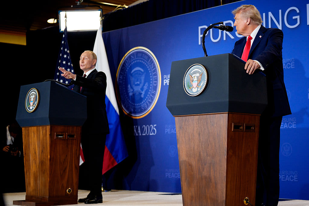 ANCHORAGE, ALASKA – AUGUST 15: Russian President Vladimir Putin, accompanied by U.S. President Donald Trump (R), speaks during a press conference at Joint Base Elmendorf-Richardson on August 15, 2025 in Anchorage, Alaska. The two leaders are meeting for peace talks aimed at ending the war in Ukraine. (Photo by Andrew Harnik/Getty Images)