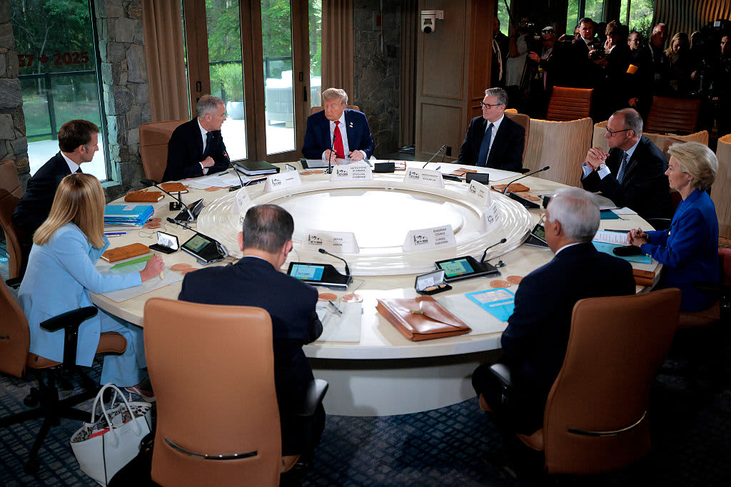 KANANASKIS, ALBERTA – JUNE 16: (L-R) Italian Prime Minister Giorgia Meloni, French President Emmanuel Macron, Canadian Prime Minister Mark Carney, U.S. President Donald Trump, British Prime Minister Kier Starmer, German Chancellor Friedrich Merz, European Union Commission President Ursula von der Leyen, European Union Council President Antonio Costa and Japanese Prime Minister Shigeru Ishiba participate in a meeting at the G7 Leaders’ Summit on June 16, 2025 in Kananaskis, Alberta.