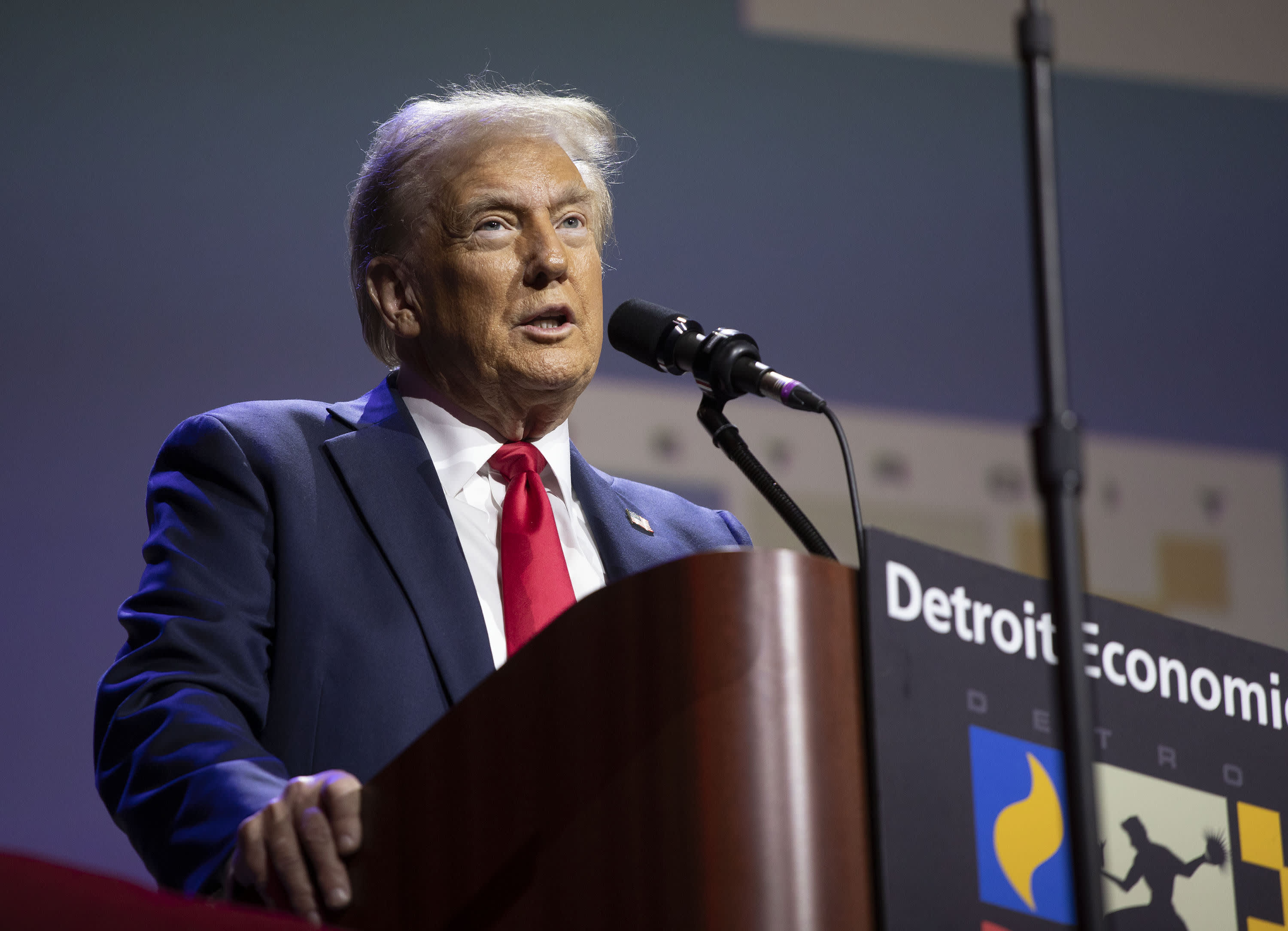 Republican presidential nominee, former U.S. President Donald Trump, speaks at the Detroit Economic Club on October 10, 2024 in Detroit, Michigan.